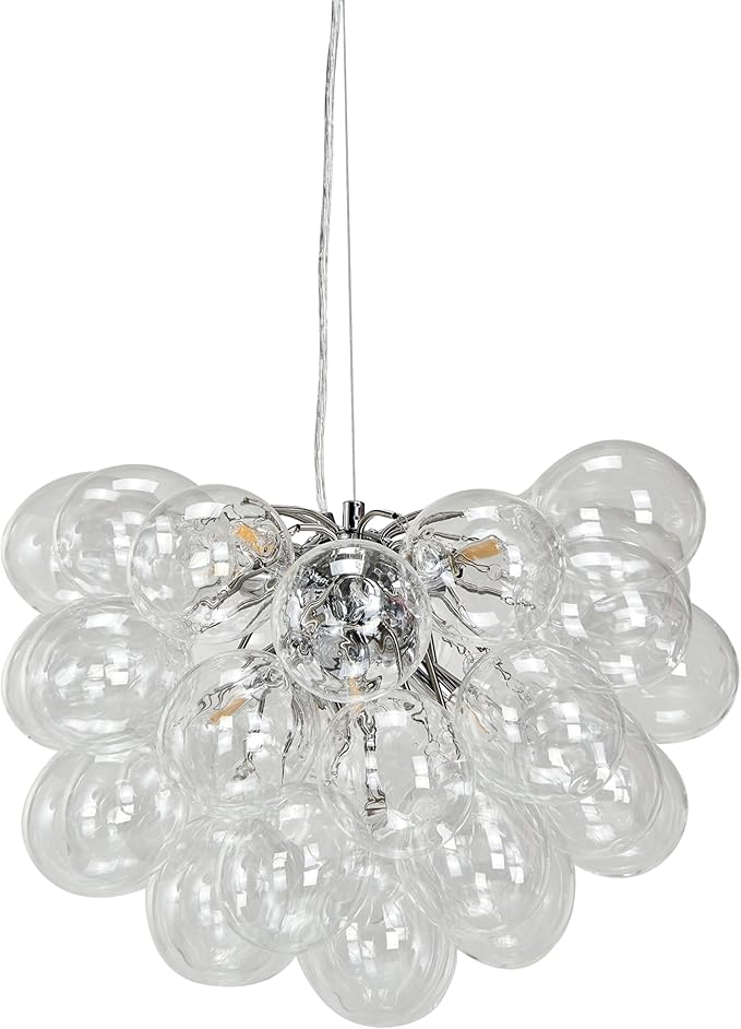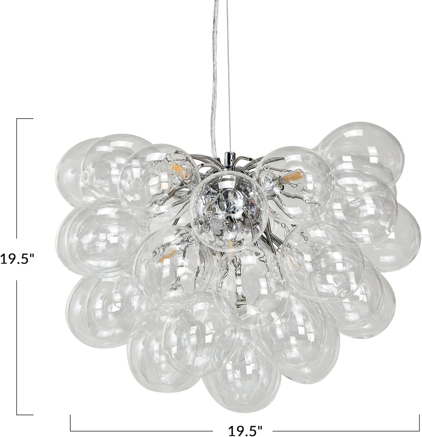 This Glass and Metal Pendant Lamp is a stunning lighting fixture that combines both form and function. The lamp provides ample illumination and creates a warm, inviting atmosphere in any space. The 6-foot cord allows for versatile installation options, making it suitable for various ceiling heights and room configurations. Designed to be hardwired, this pendant lamp requires 8 G9 LED bulbs, each with a maximum wattage of 25 watts, ensuring energy efficiency and bright lighting. The lamp's dimensions, measuring 19.5 inches in diameter and 19.5 inches in height, perfect for dining rooms, living areas, or entryways. Its modern and elegant style seamlessly integrates into contemporary interiors, adding a touch of sophistication and charm to any room.