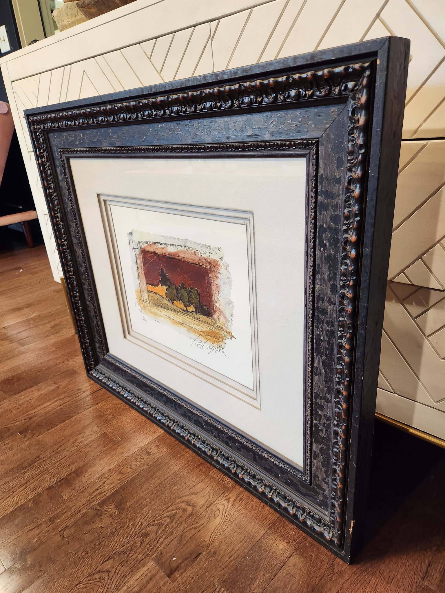 Artwork of a nature scene that is beautifully displayed within an ornate wooden frame. There is a wire on the back of the frame to assist with hanging this sturdy picture. It has been used in staging. Make it yours today! 34"W x 29"H x 2" Thick