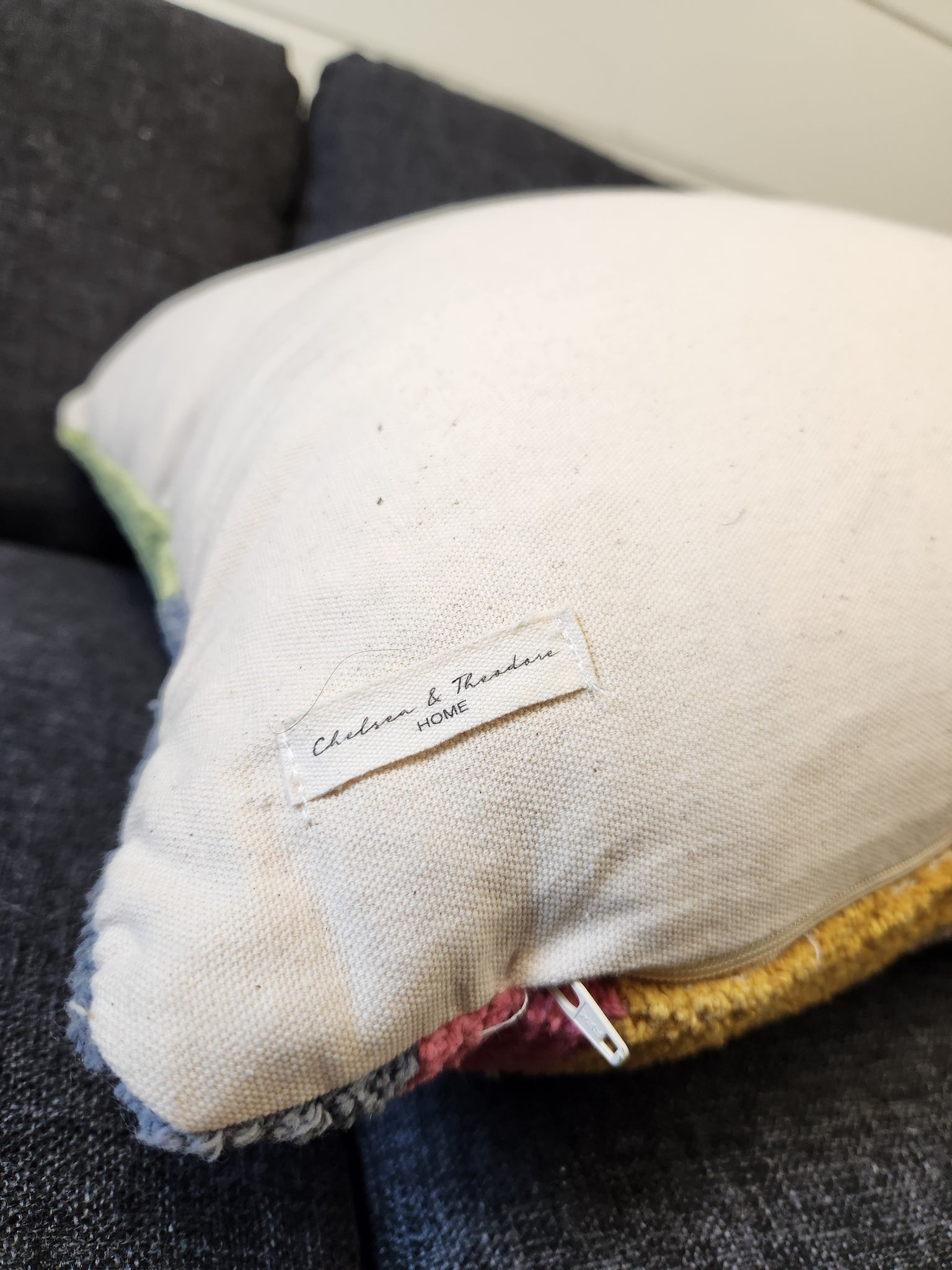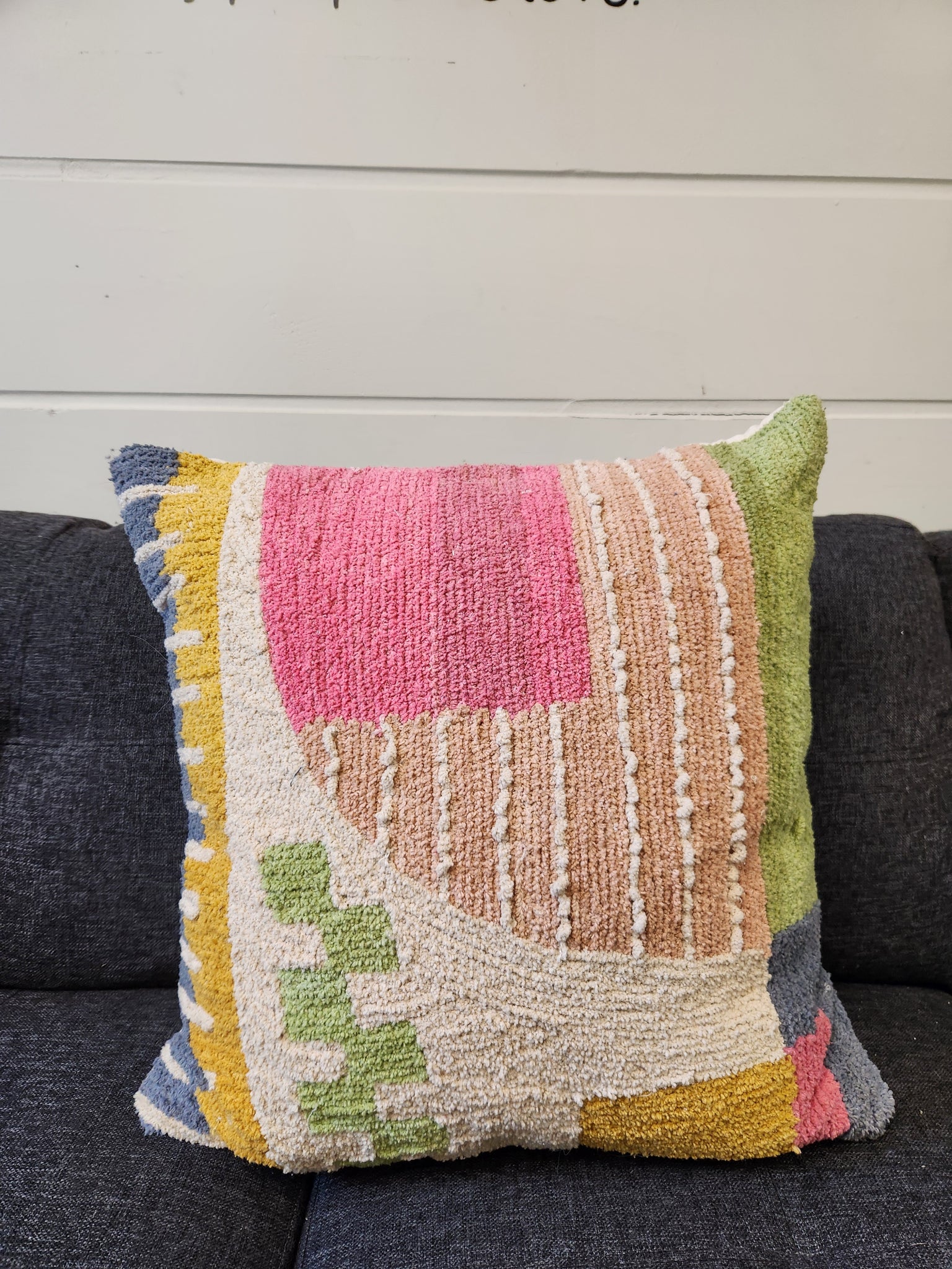 This fun multi-color throw pillow is a kiss of texture and style. The abstract pattern and bright colors make it an instant eye-catcher. The colors also make it a perfect addition to your spring decor.