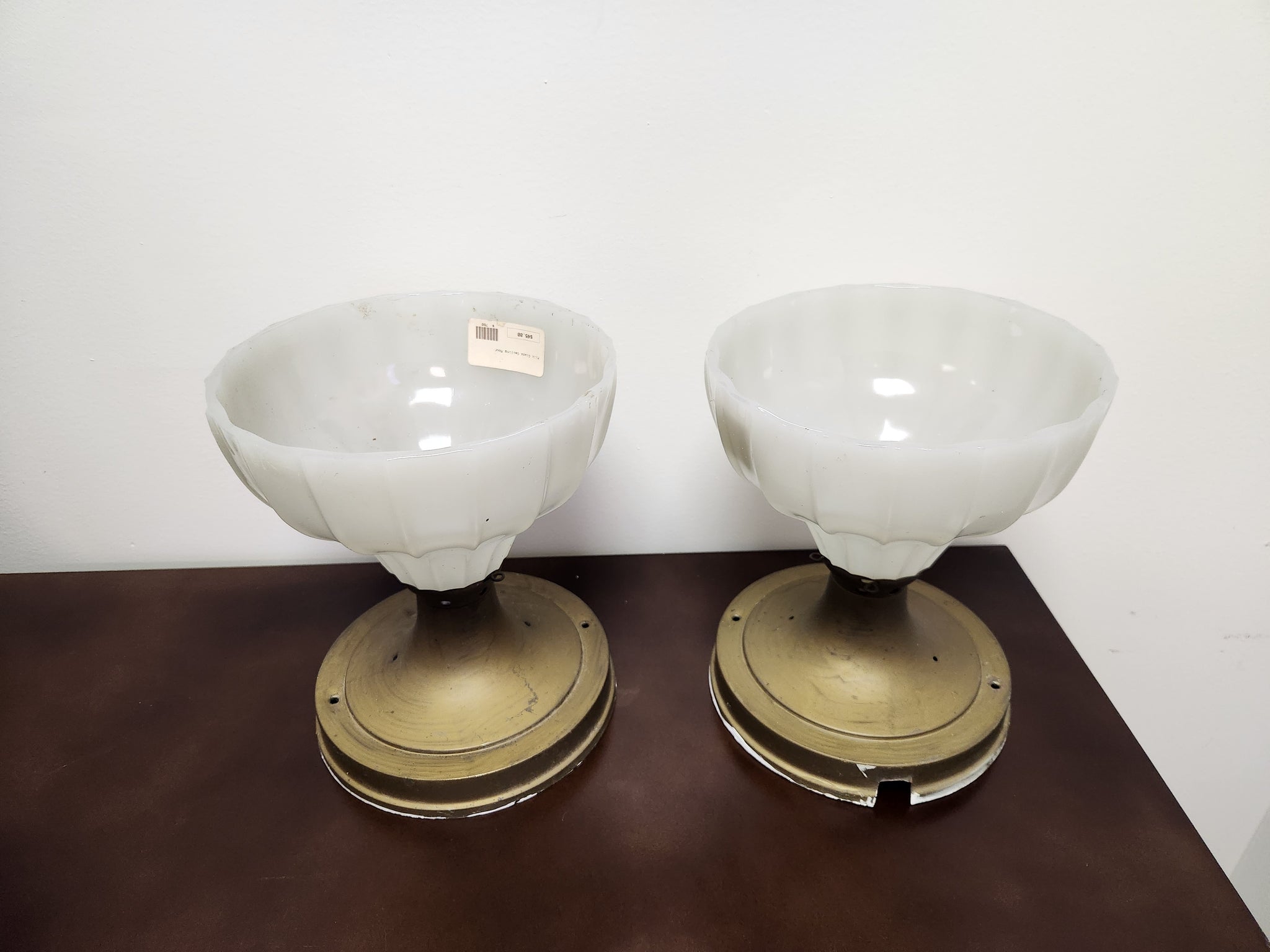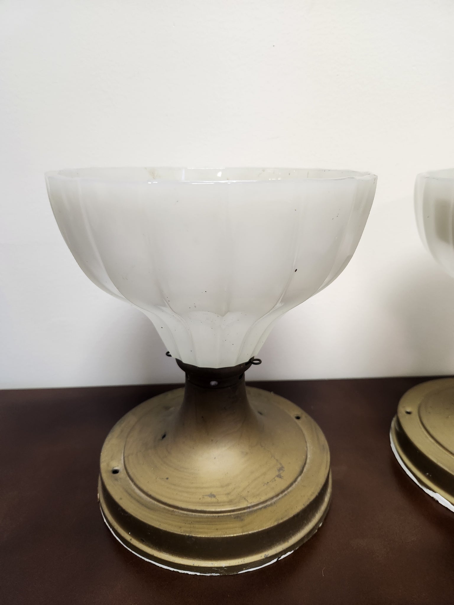 These charming vintage ceiling lamps are perfect for collectors and antique-lovers. They boast pleated glass shades and metal bases. There are some paint stains at the edge of the metal base from its previous historic home. Bring them home or gift them today!