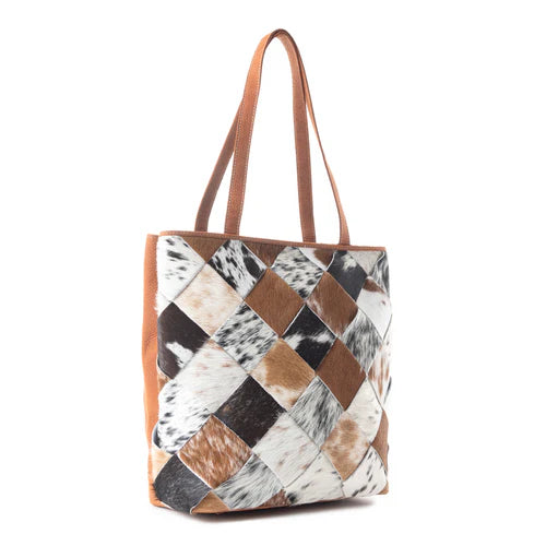 Elevate your style with the weave patterned concealed carry bag, a stunning blend of rugged charm and artisanal elegance. The front showcases unique geometric designs in hairon hide, while the rich brown genuine leather back offers a sleek contrast, complete with a spacious zipper pocket. Spacious and practical, this western leather bag is perfect for everyday Southern adventures, embodying the free-spirited essence of hairon cowhide leather handbags with a bold, stylish edge.