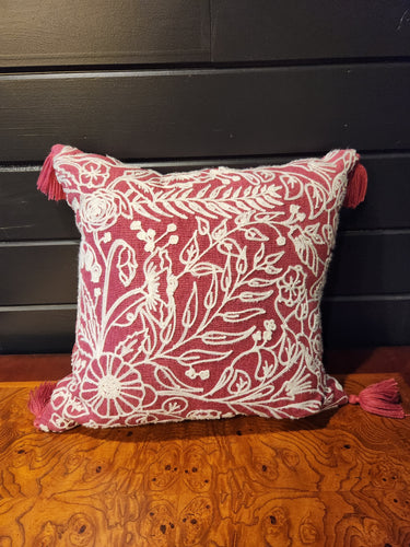 Pink Throw Pillow W/ Foliage Pattern and Tassels