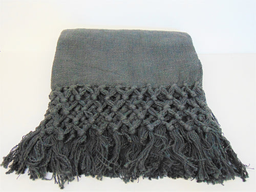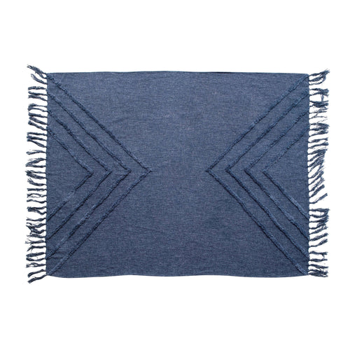 Slub Blue Throw Blanket with Tufted Chevron Pattern and Tassels